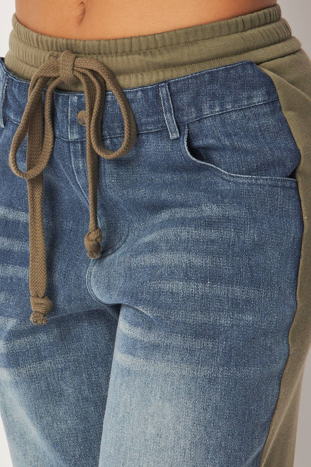 Our April Straight Leg Denim Jean Sweatpants, Denim Detail At Front & Back, Elastic Drawstring Waistband, Faux Front Button Closure, High Rise Waist, Straight Leg.