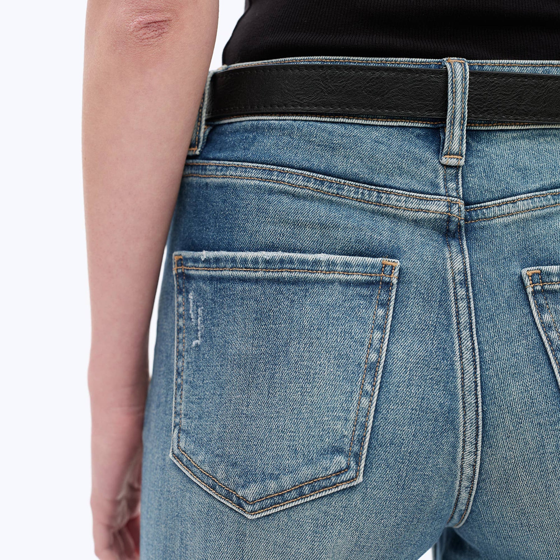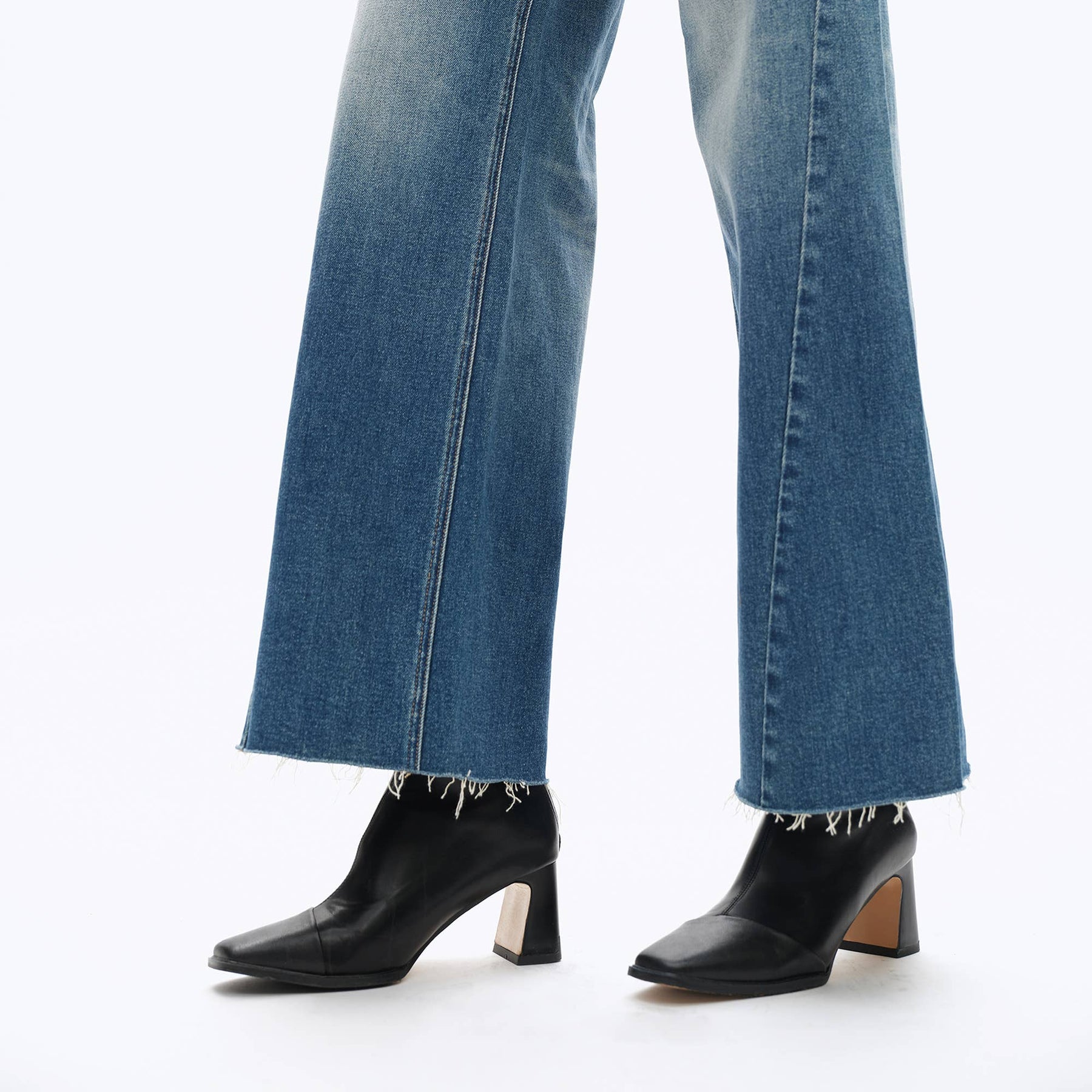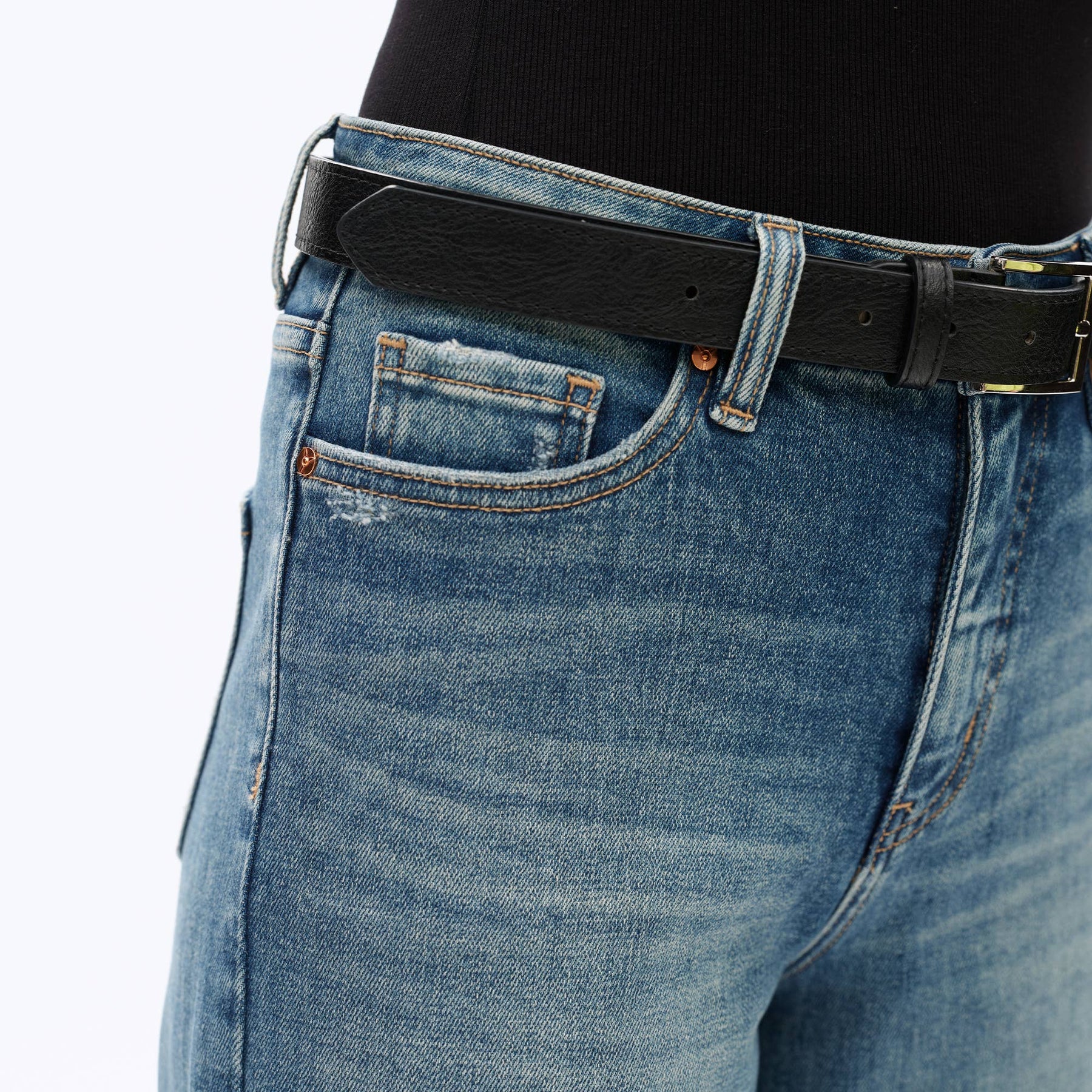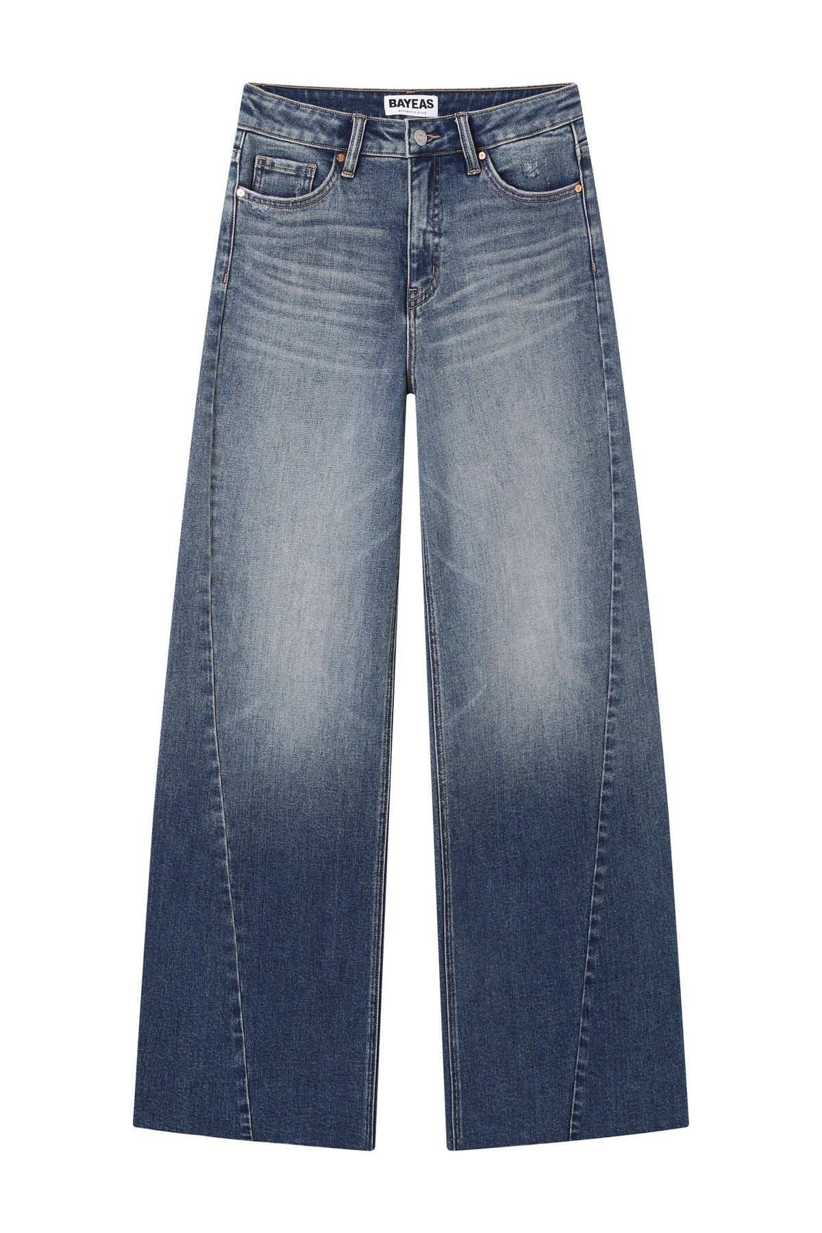 CRAFTED FROM COMFORT STRETCH DENIM MEDIUM BLUE FIVE POCKETS, GRINDING AT POCKET OPENING, HIGH RISE WAIST, ZIPPER FLY, SEAM DESIGN, NATURAL WASHING EFFECT, WHISKER EFFECT, RAW HEM, DENIM JEANS