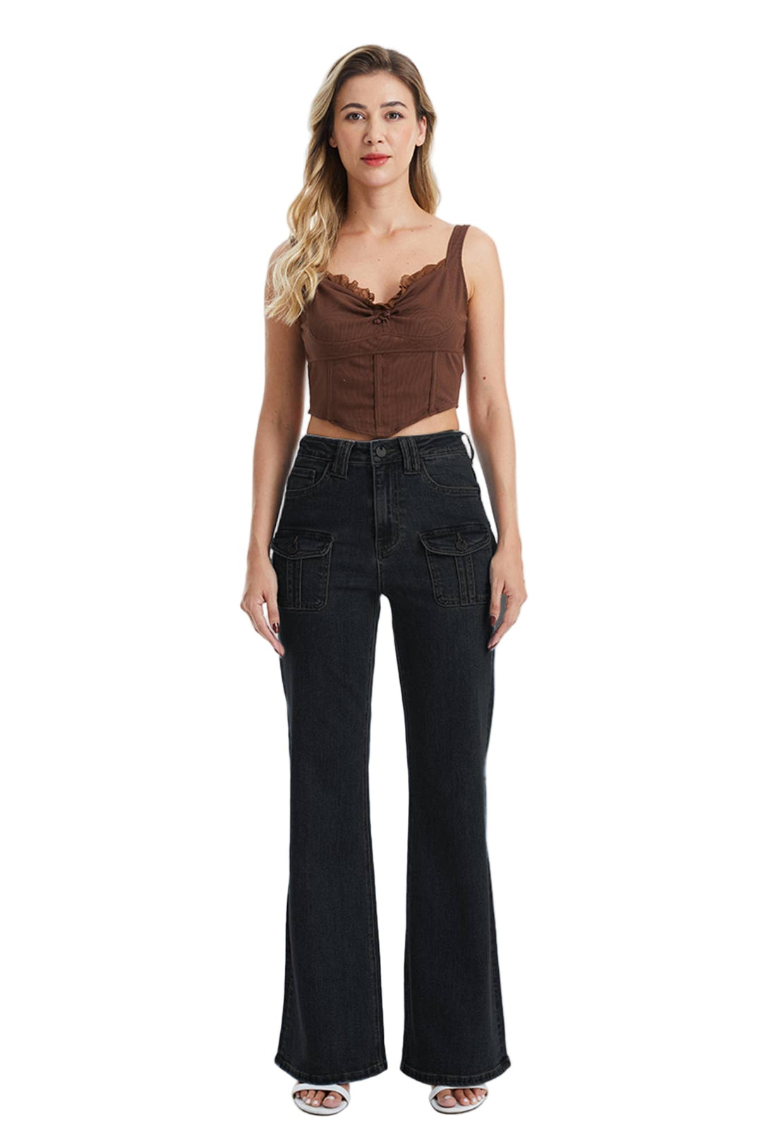 Mid Rise Side Panel Snap Up Wide Leg Jeans: LIGHT WASH
