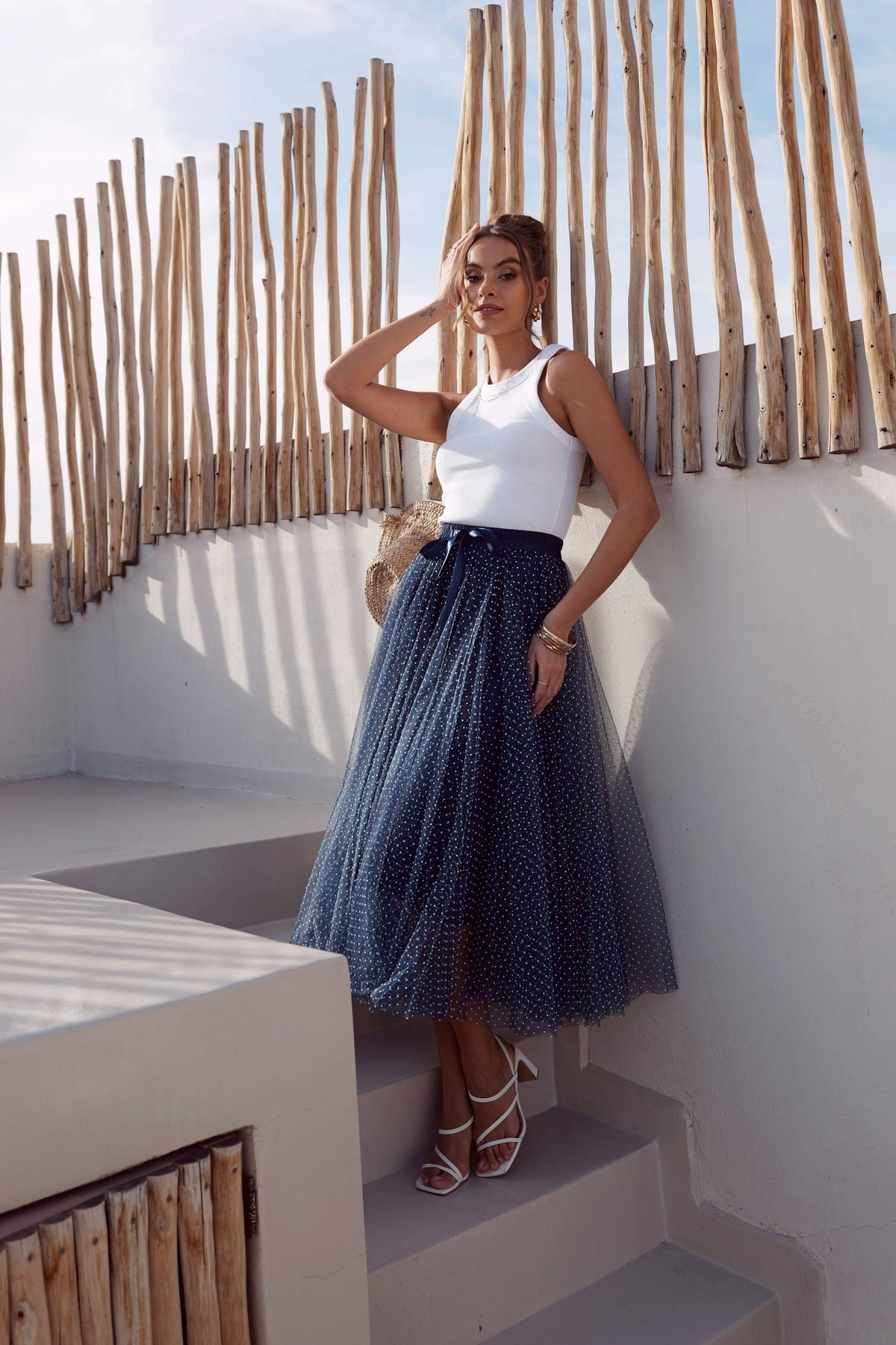 Long tulle skirt with plumetis (velvet polka dots) and a fine elastic waistband. Playing with volumes, this iconic skirt stands out with a flared cut, enhanced with gathers, offering a ruffled effect at the bottom.
