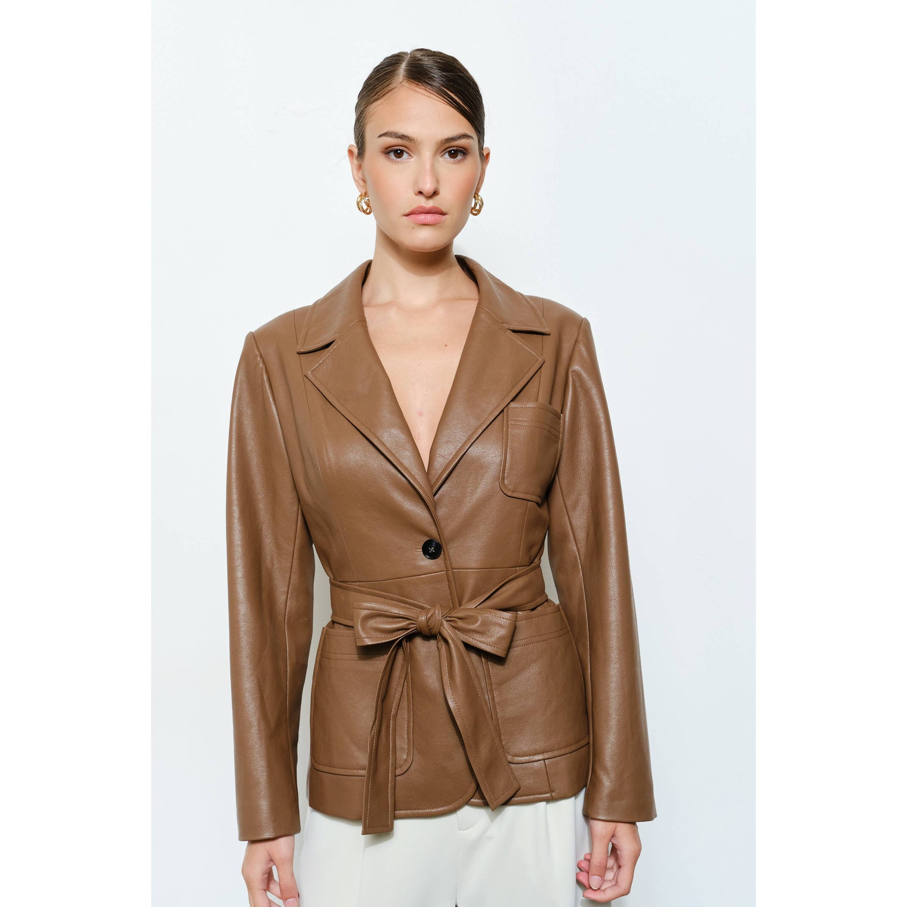 Faux Leather Single-Breasted Belted Blazer Jacket