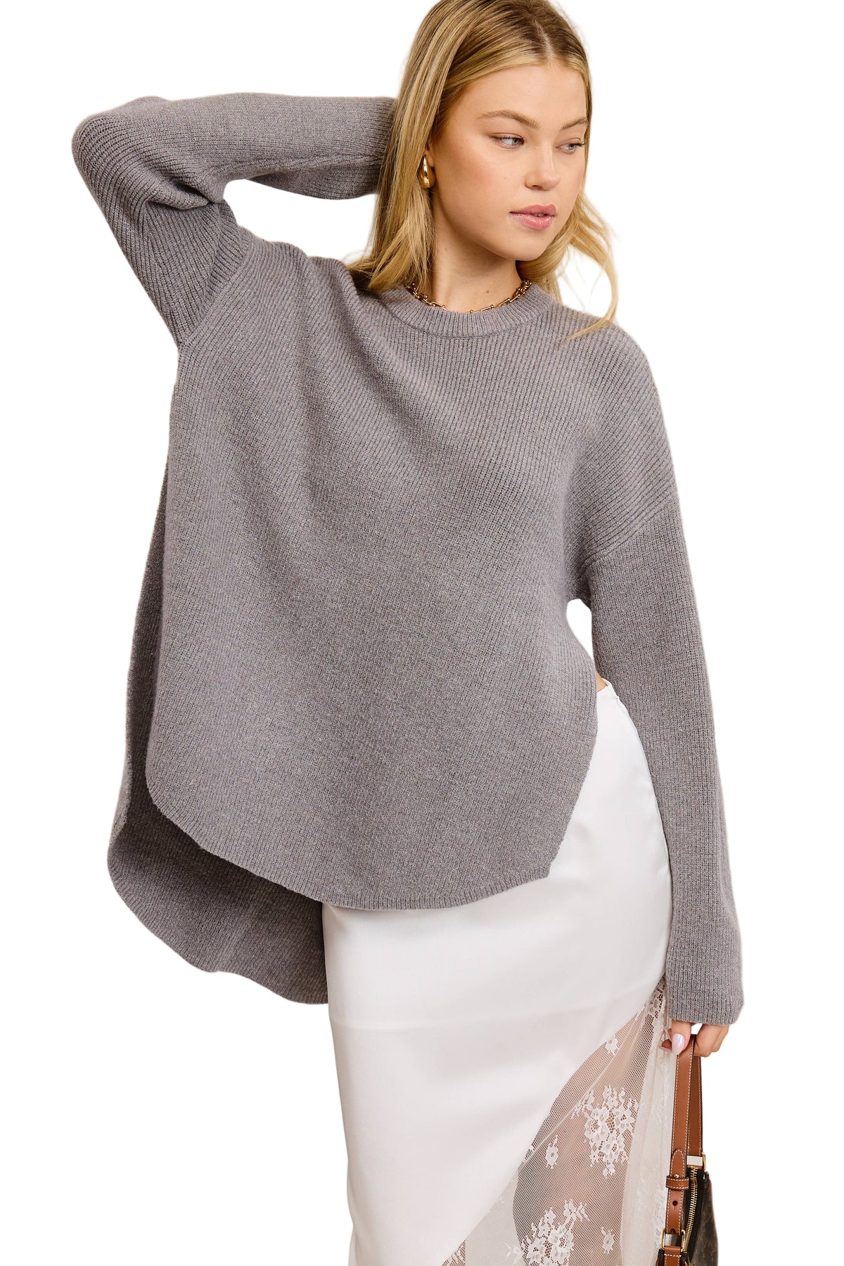 Cozy and soft solid ribbed knit long sleeve sweater top featuring a round neckline, dual side slit hem and high-low shirttail hem design, complete with a relaxed and oversized fit.