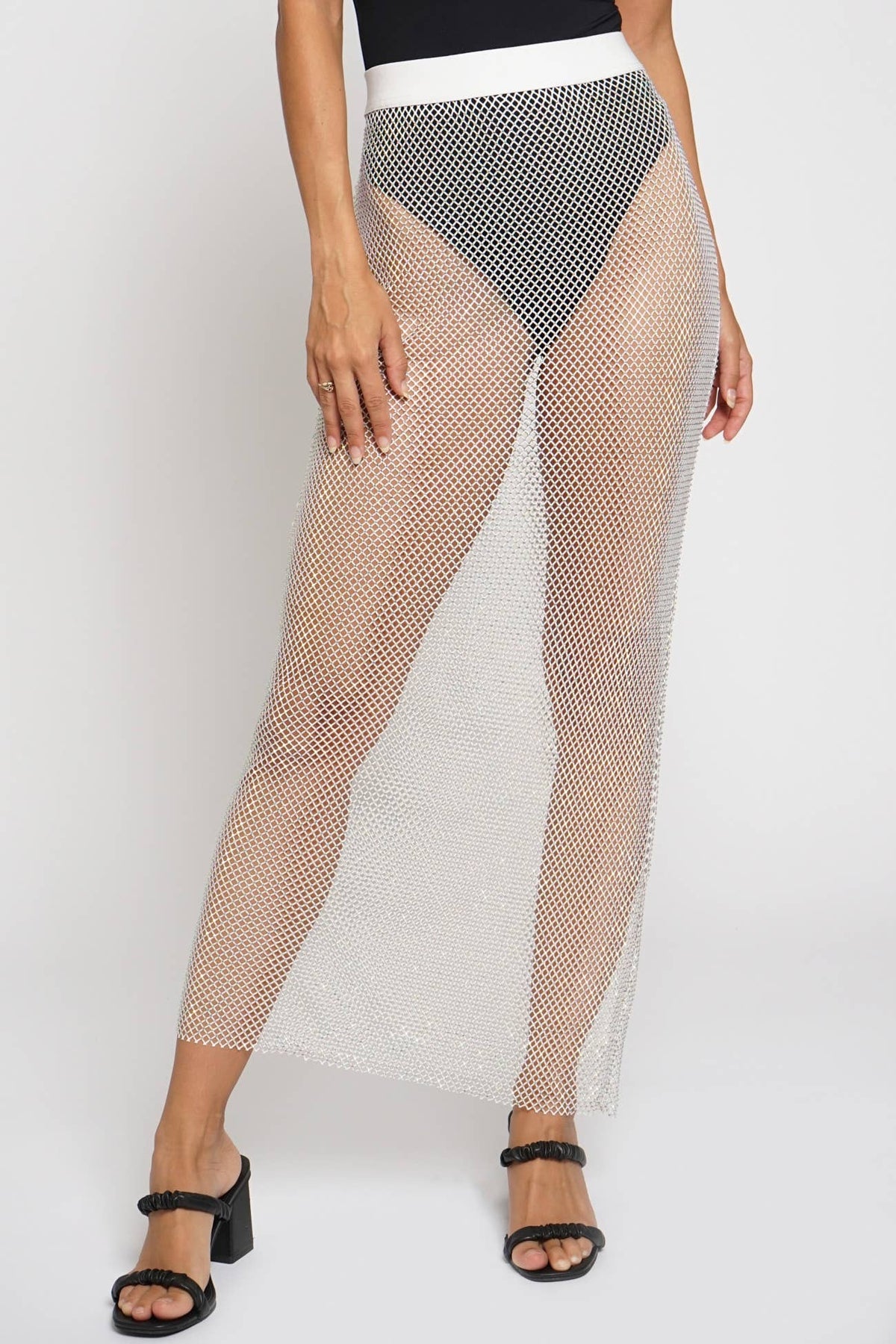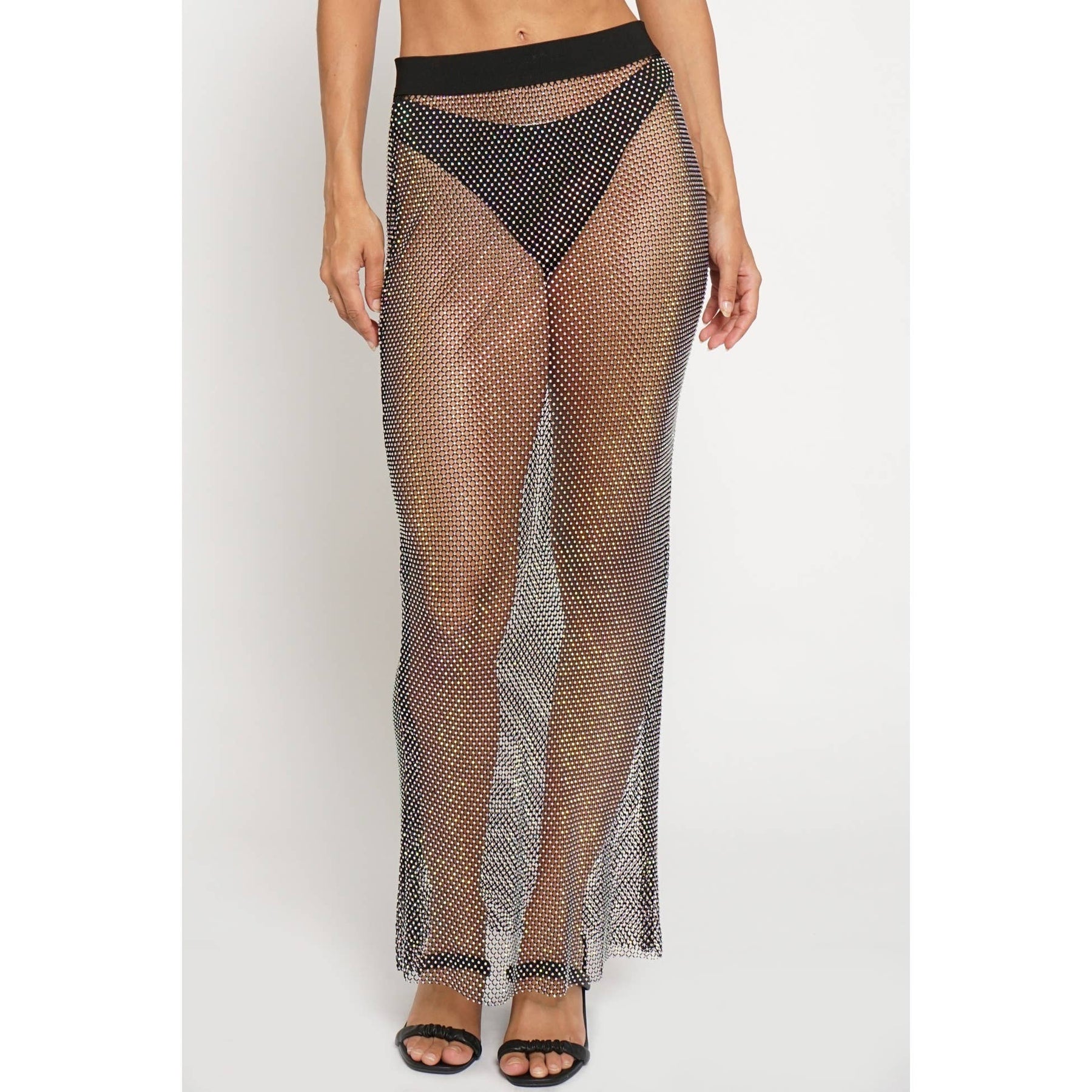 - 100% Polyester - Knit - Rhinestone accented mesh - See through - Pull on waist - Maxi length